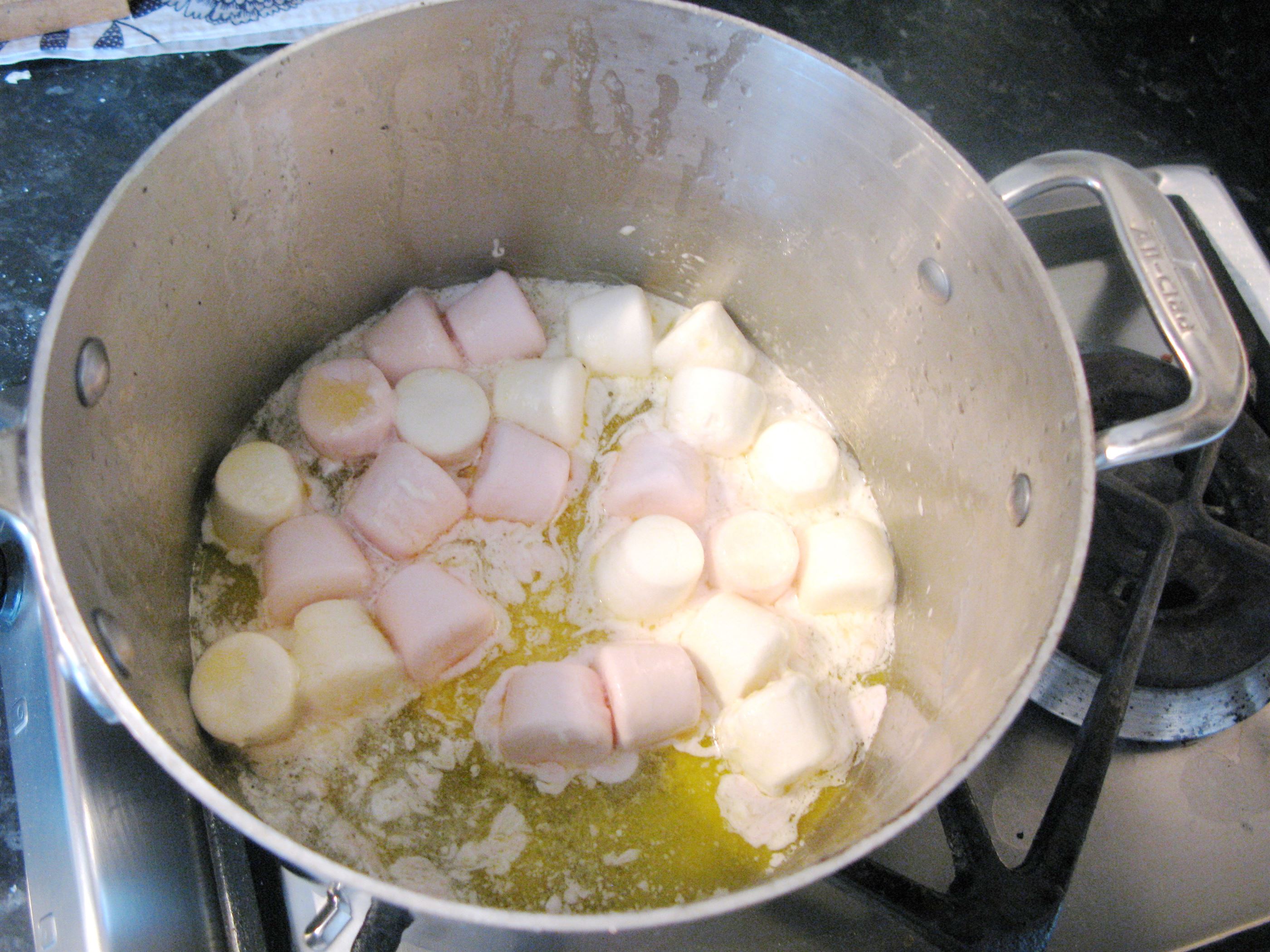 1. In a large saucepan over a low heat, melt the butter, then add the marshmallows and melt these, constantly stirring so they dont catch.